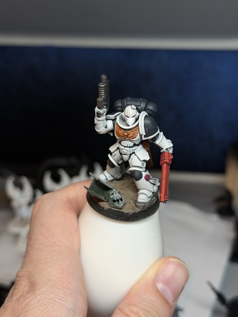 Eventually having got close to something I liked with the Grey Knight test paint, I decided to use the same basic recipe for one of the assault intercessors. With a nice pale overall armour, I then hit decision paralysis on which chapter to make it.